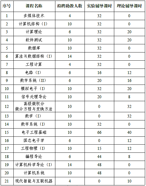学院学生教学助理岗位将根据每门梅大课程的实际修读人数配备,原则上按每15名学生设置1个岗位。2020-2021学年第一学期具体选聘课程、拟聘人数及预计工作量详见下表: