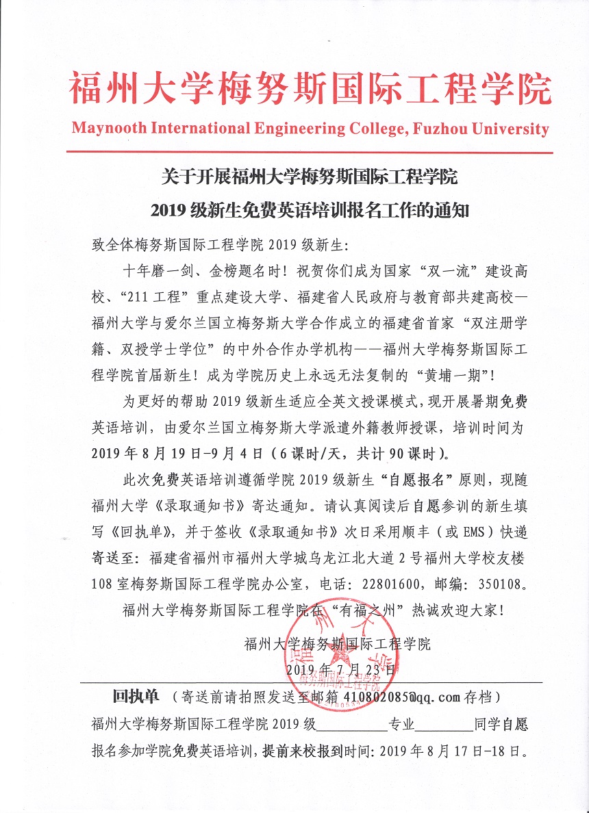 为帮助大家适应全英文授课模式,现学院决定开展免费英语培训,时间为2019年8月19日-9月4日(6课时/天,90课时),遵循“自愿报名”原则。大家收到的91社区 《录取通知书》中将会随寄培训报名通知,请自愿报名新生按要求将《回执单》寄回。通知详见下图: