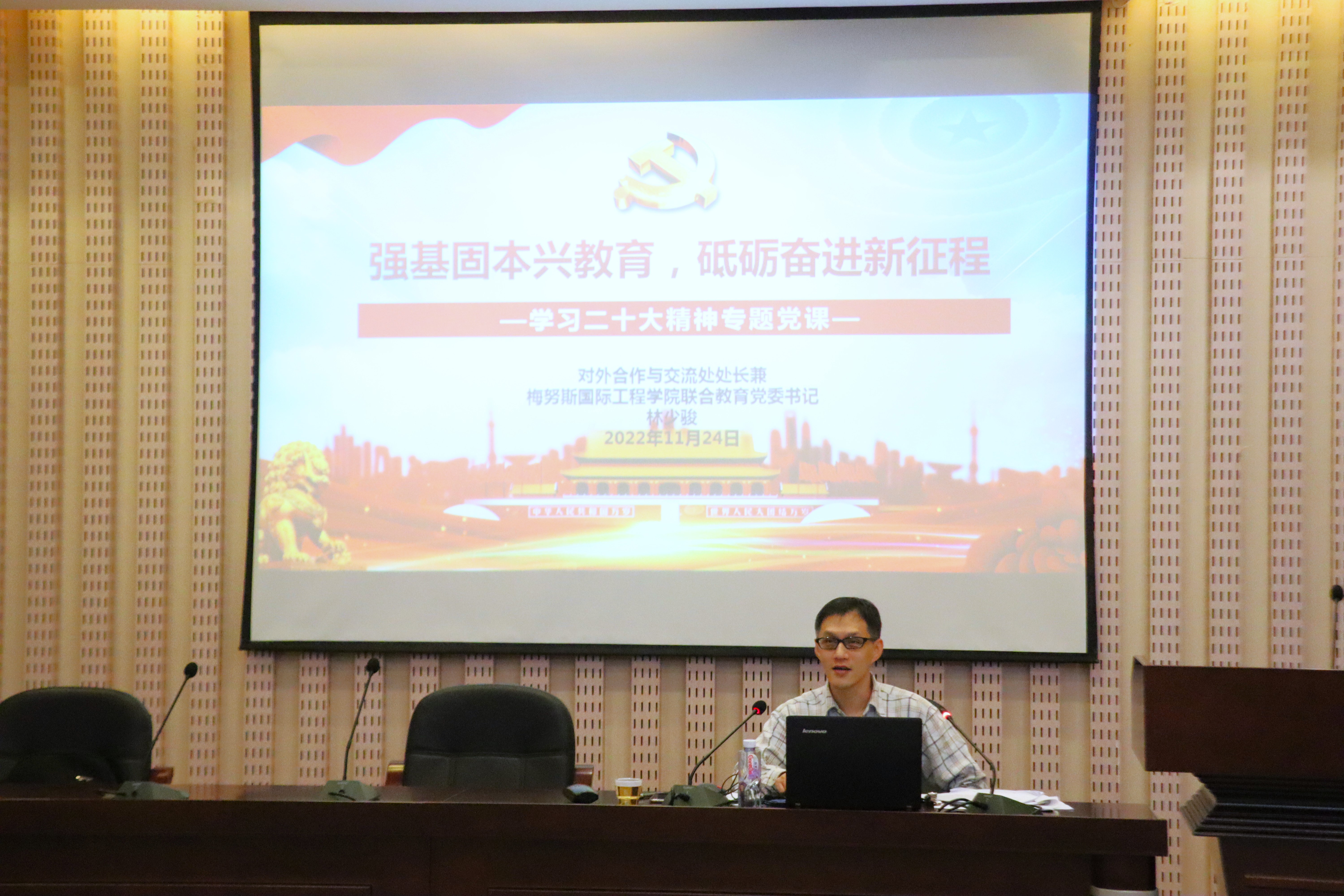 联合教育党委林少骏书记主讲,梅努斯学院各年级党员、发展对象和积极分子代表等30余人参加。